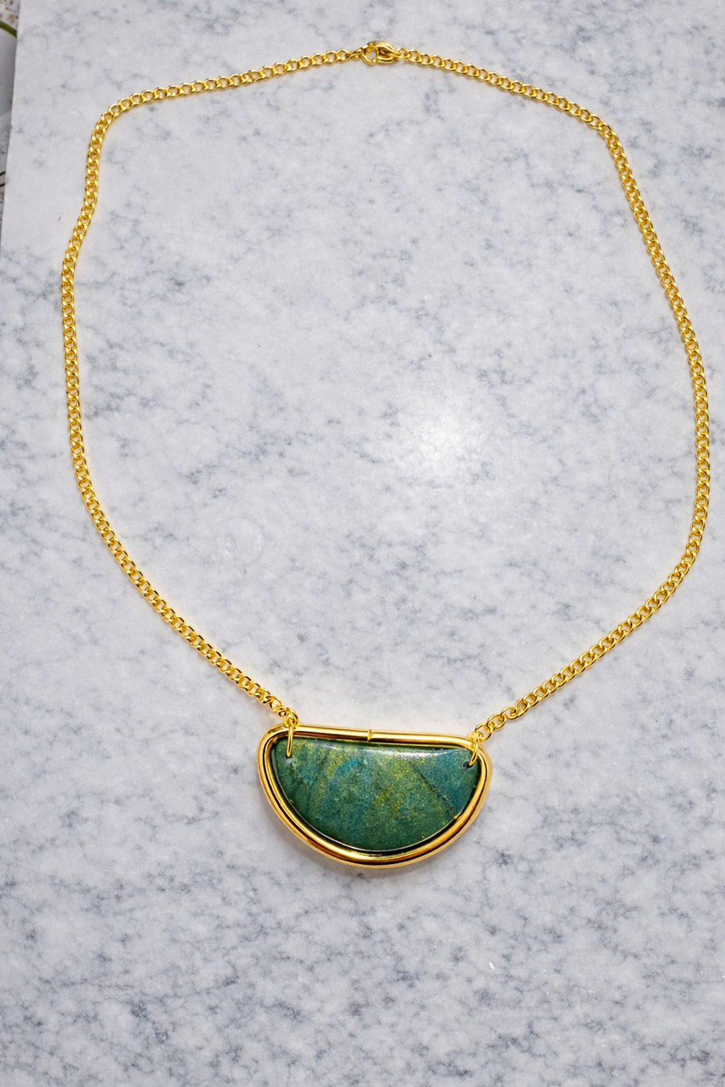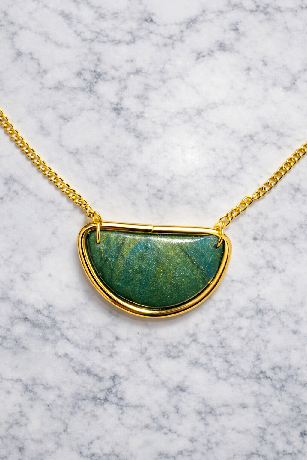 Designed to evoke calm coastal waters, this gold crescent necklace features hand-layered teal and sea-green hues accented with fine golden shimmer. The semi-circular pendant is framed in polished gold and suspended from a matching gold chain for a clean, refined finish.