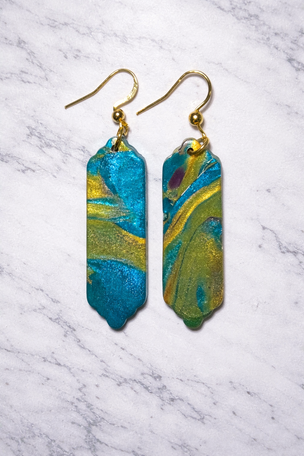 The Onda Tranquilla Drop Earrings are inspired by the gentle rhythm of ocean waves — fluid, luminous, and endlessly calming. Swirls of marbleized turquoise, sea-green, and golden shimmer flow across each handcrafted pendant, reflecting the movement of light over tranquil coastal waters.